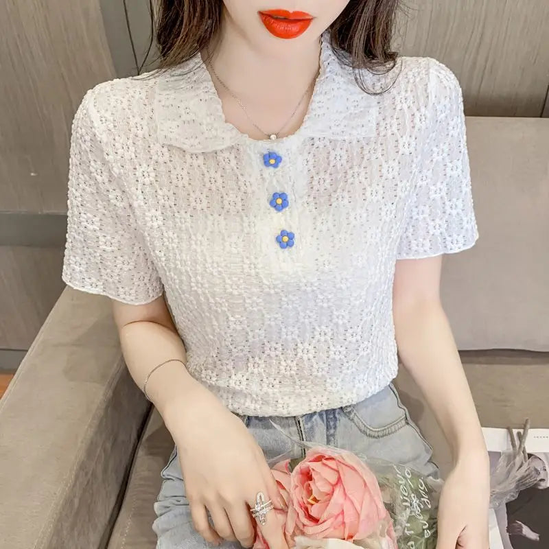 2025 New Summer Korean Version Minimalist Slim Fit Short Sleeved Round Neck Printed Contrasting Hollow Out Women's T-shirt Top