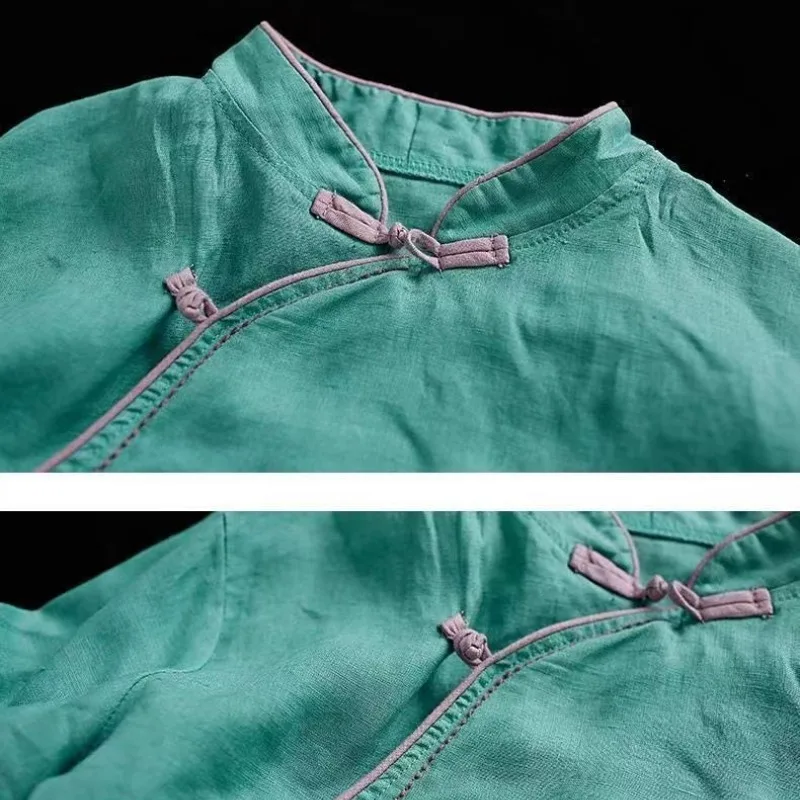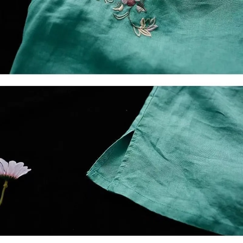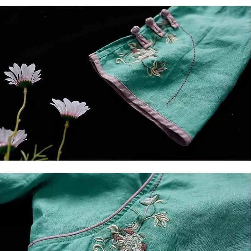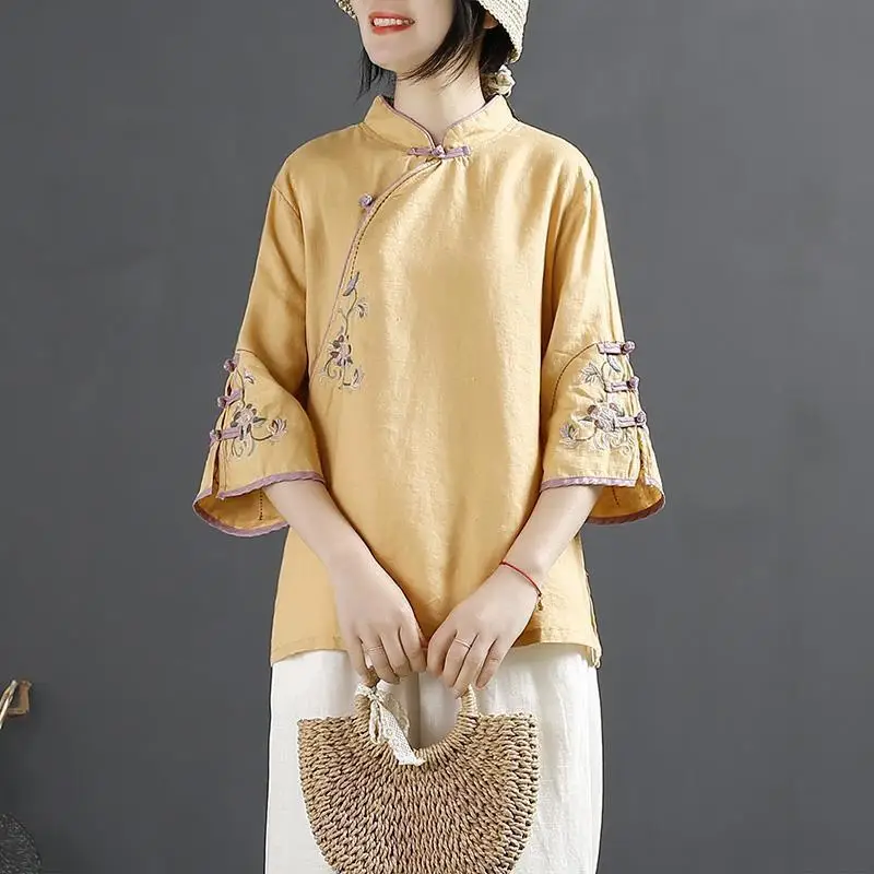 2025 New Chinese Style Retro Cotton Linen Shirt Women's Spring Summer Stand Collar Button Embroidered Three Quarter Loose Tops
