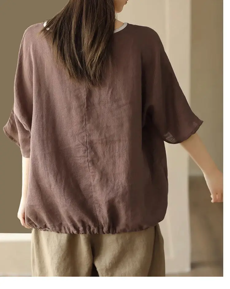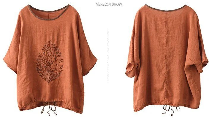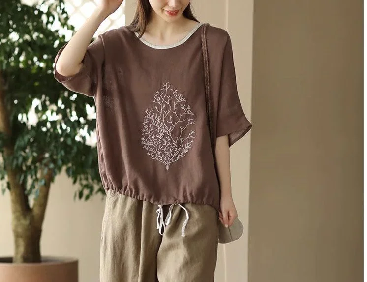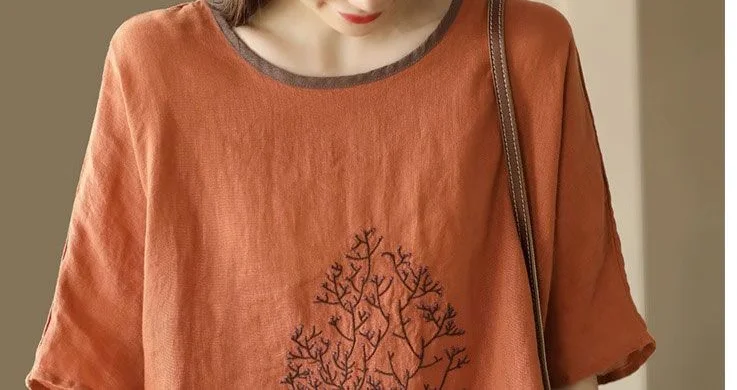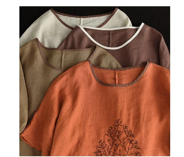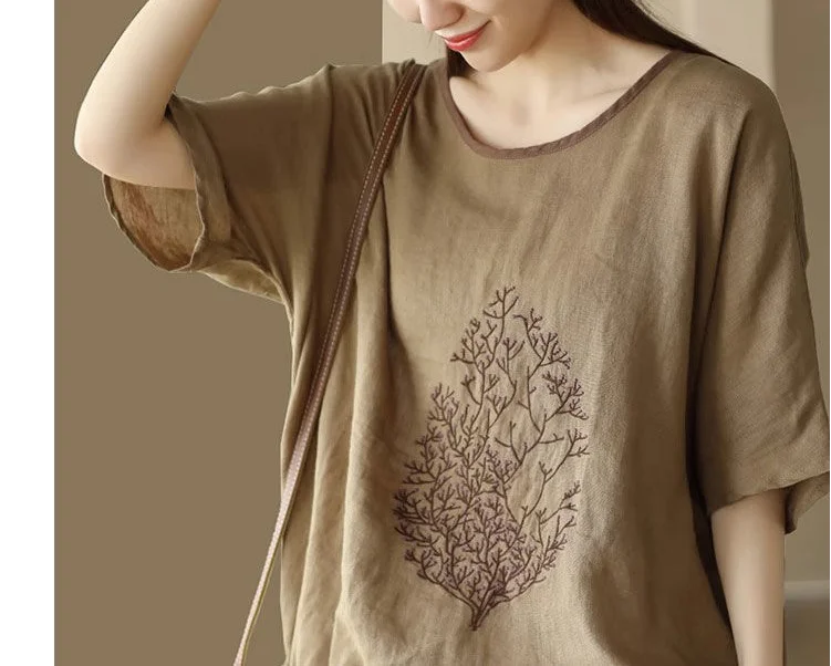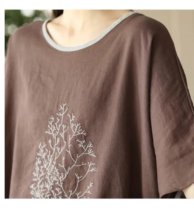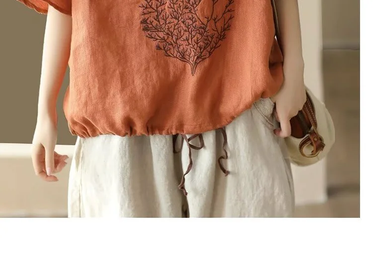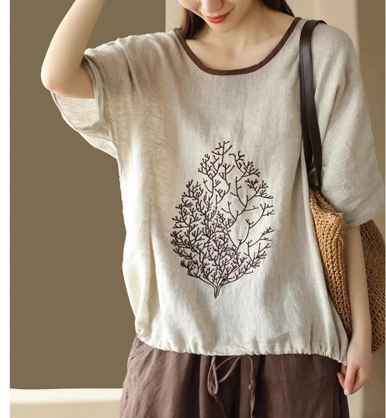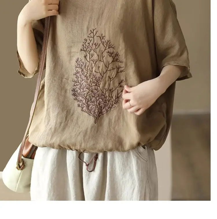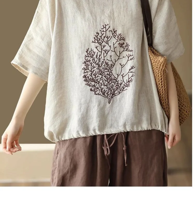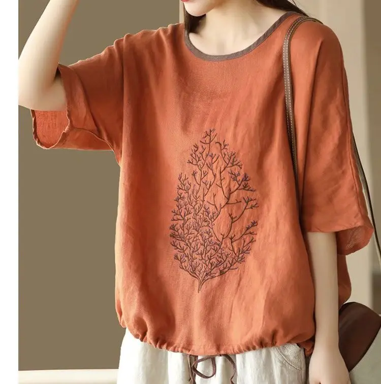 2025 New Summer Chinese Style Fashion Minimalist Loose Half Sleeve Round Neck Printed Embroidered Shirring Women's T-shirt Top