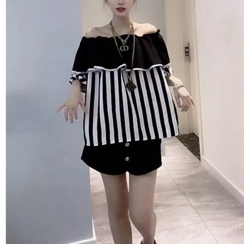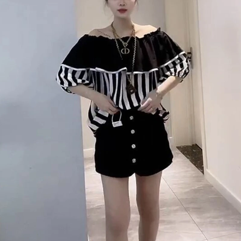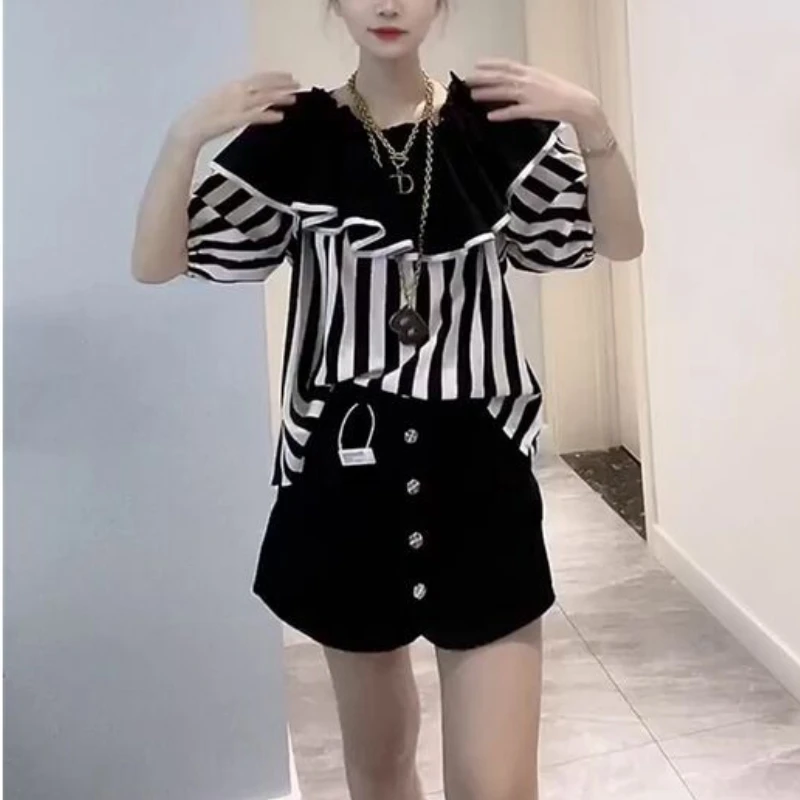 2024 New Summer Young Style Simple Loose Fitting Pullover Short Sleeved Ruffled Neck Striped Color Blocking Women's Shirt Top