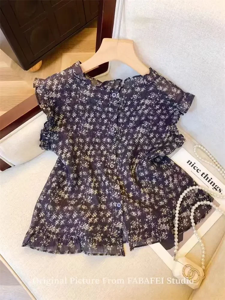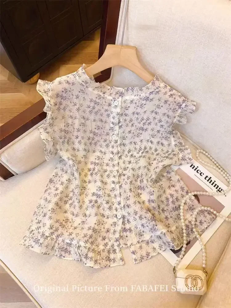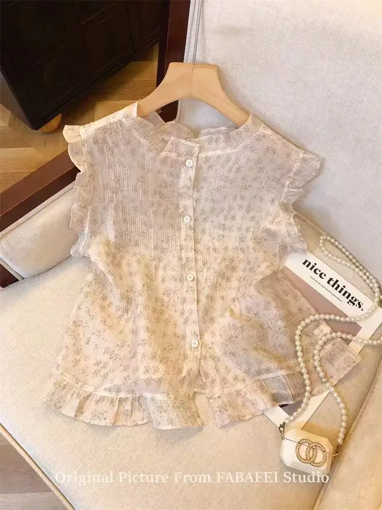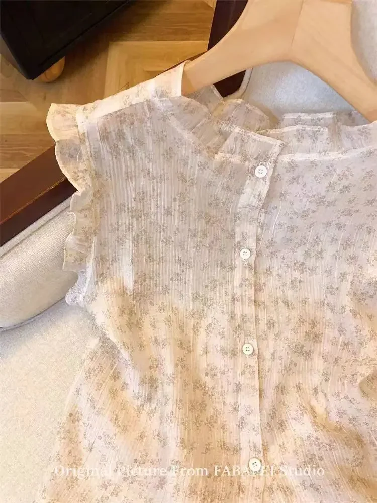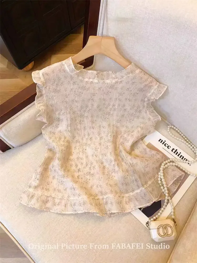 Black Ear Spliced with Flying Sleeves Floral Shirt for Women's Summer New French Chic Sleeveless Shirt