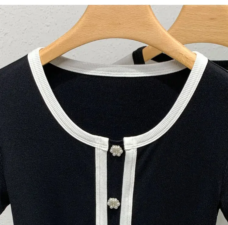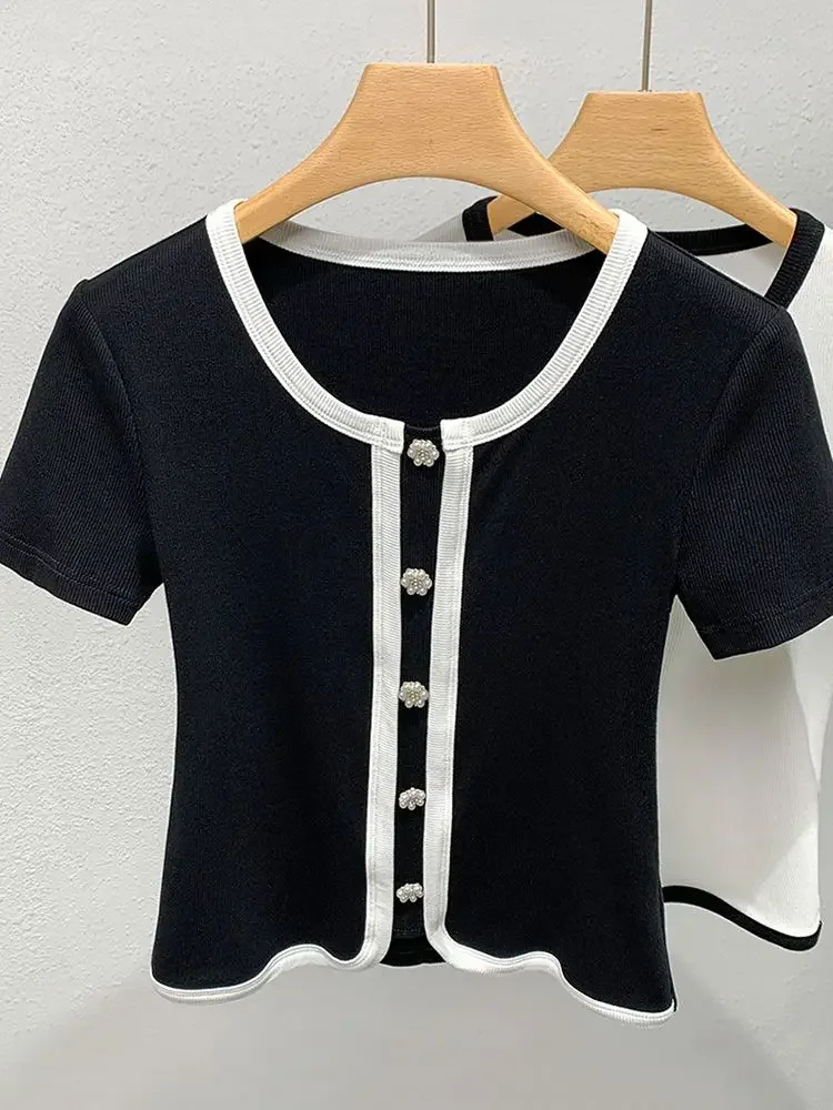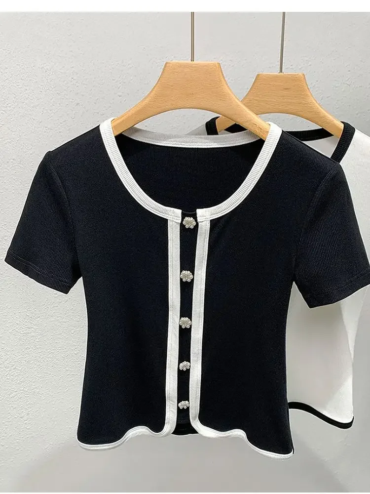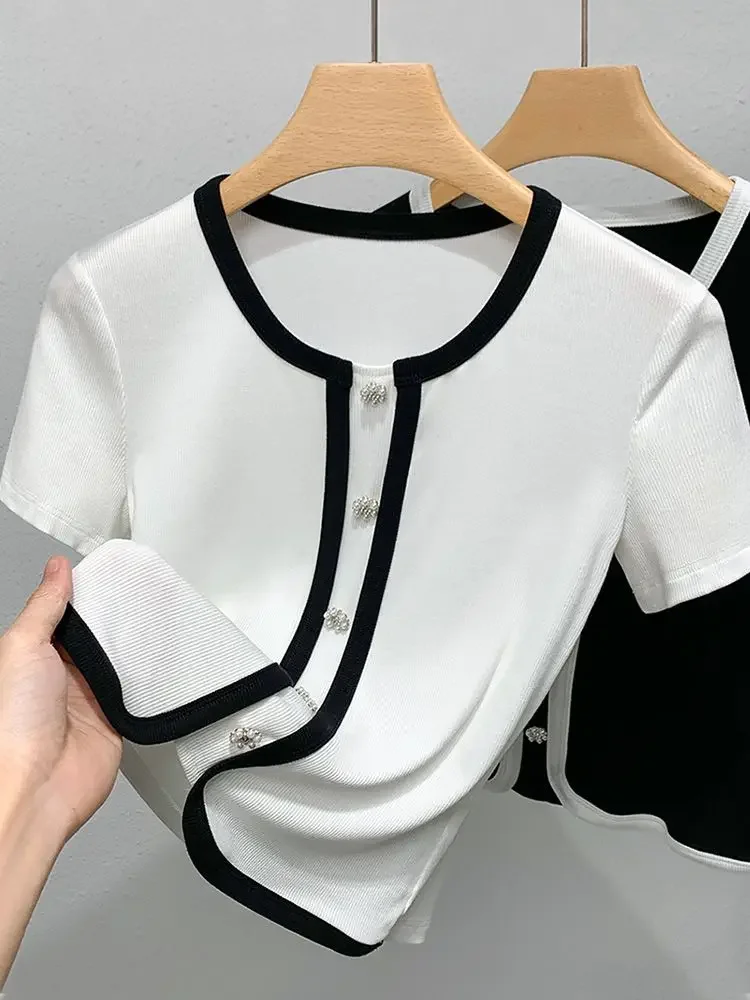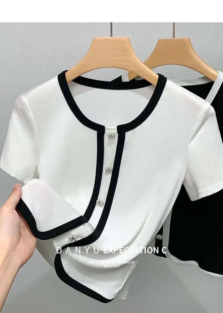 French Contrasting Tops in Summer New Style Unique Short Spliced round Neck Short Sleeve T-shirt
