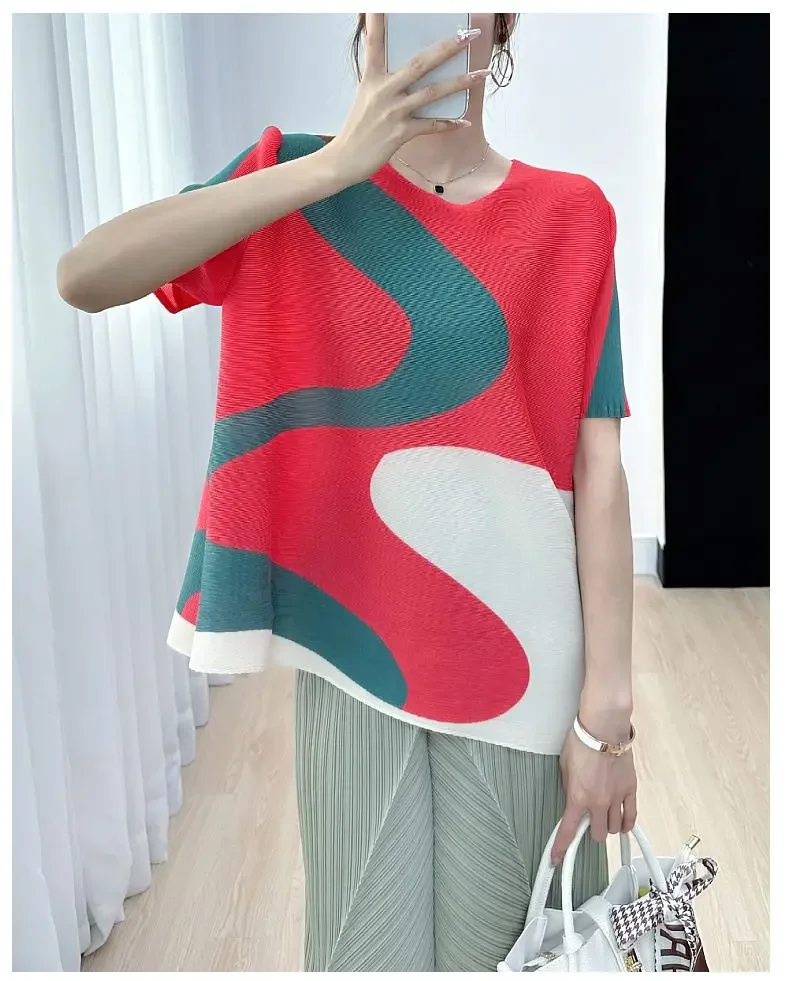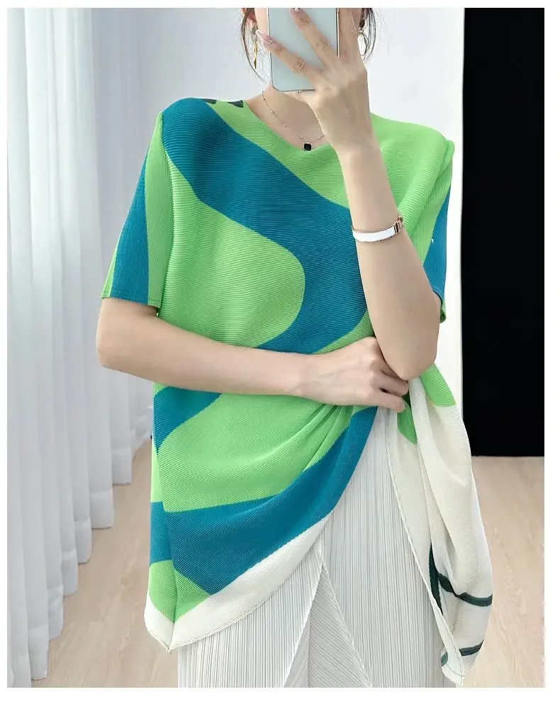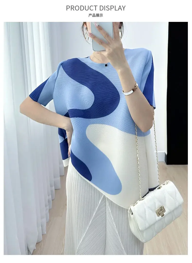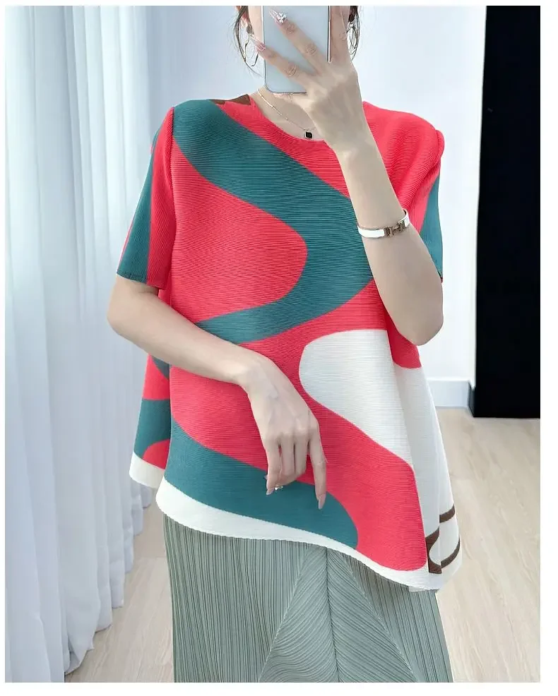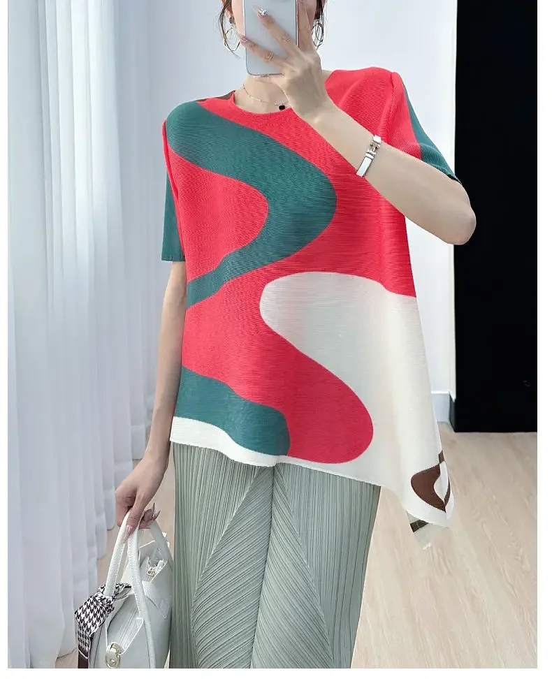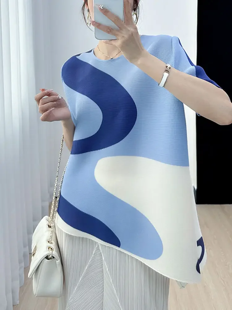 New Summer Printed T-shirt Pleated Loose Round Neck Short-sleeved Top