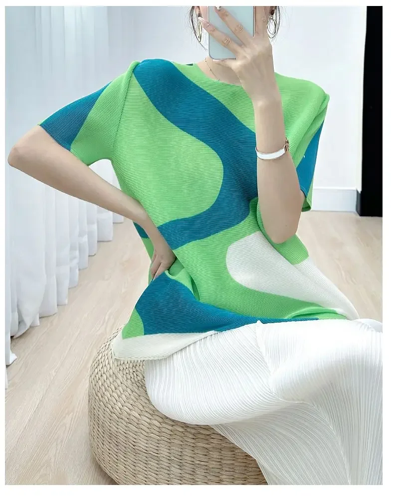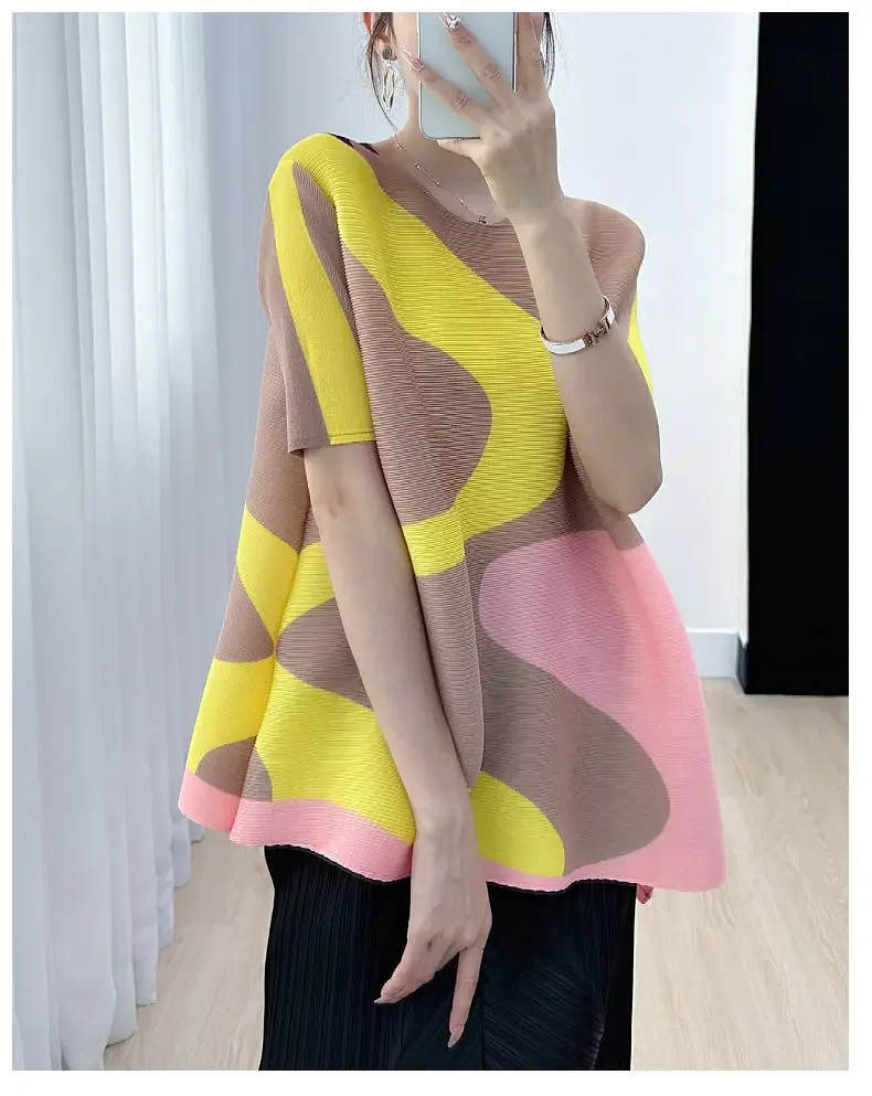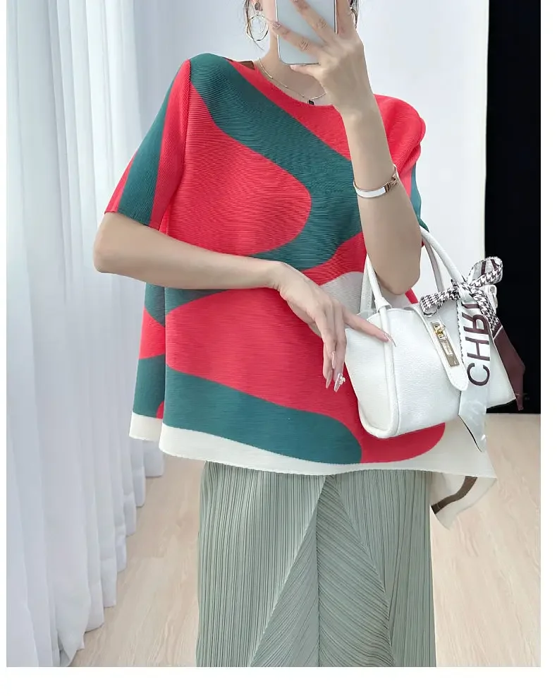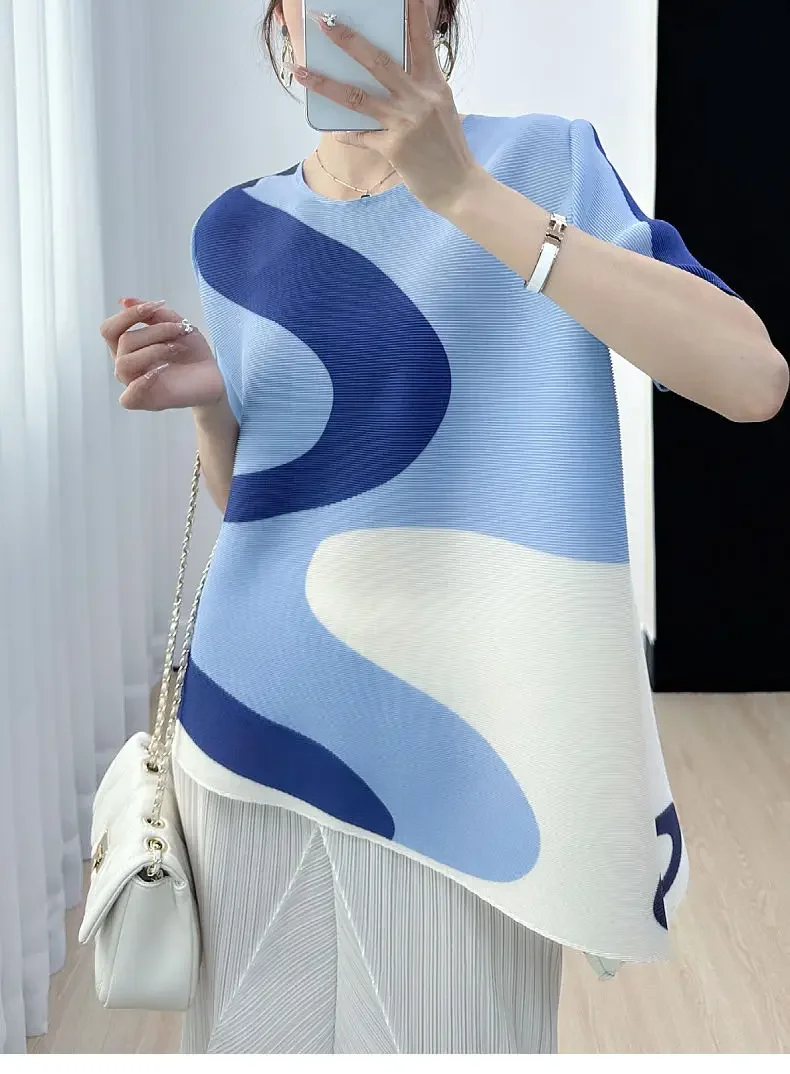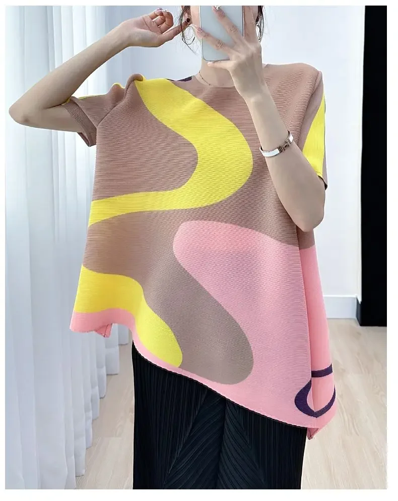 New Summer Printed T-shirt Pleated Loose Round Neck Short-sleeved Top