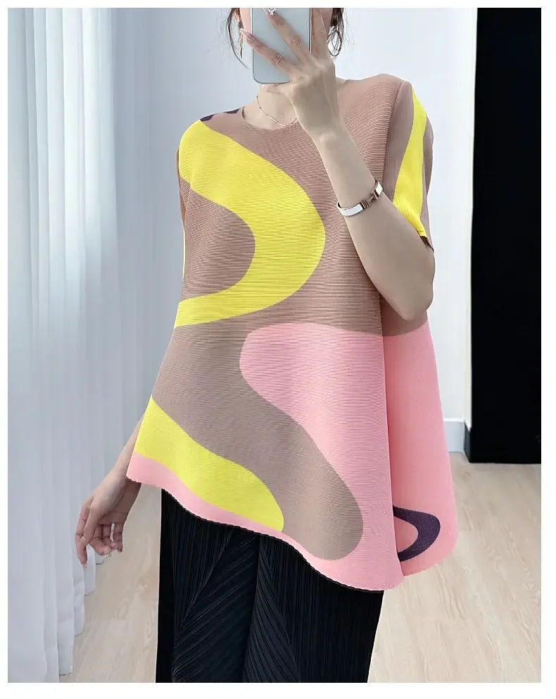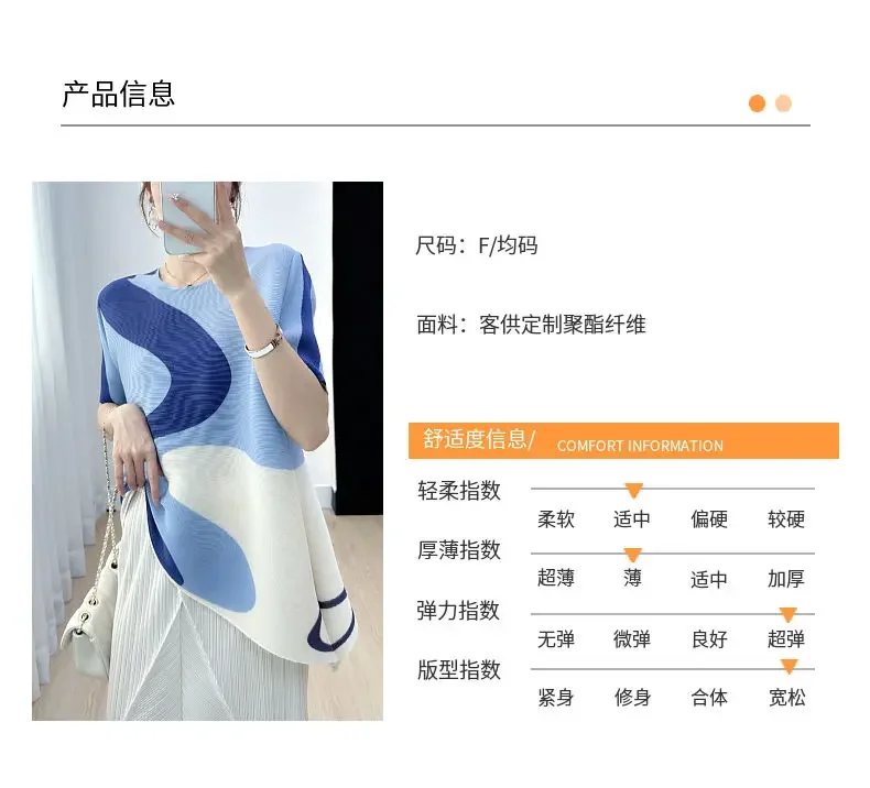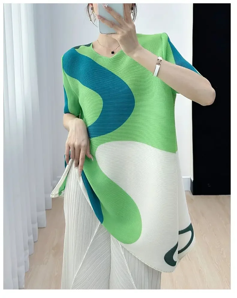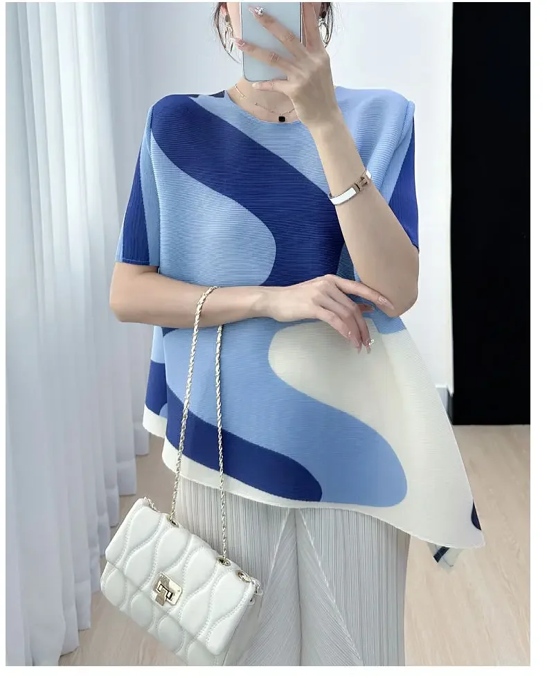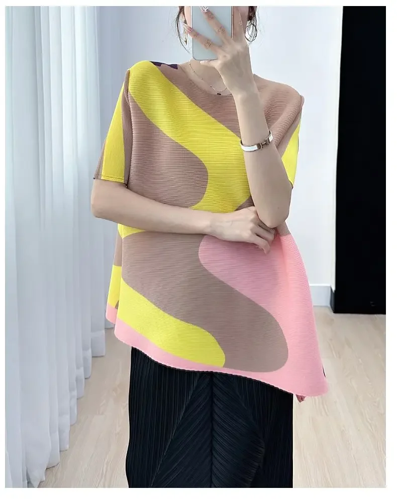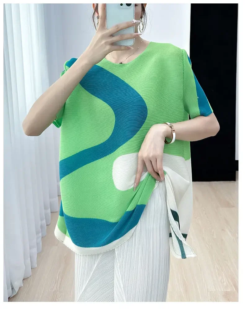 New Summer Printed T-shirt Pleated Loose Round Neck Short-sleeved Top